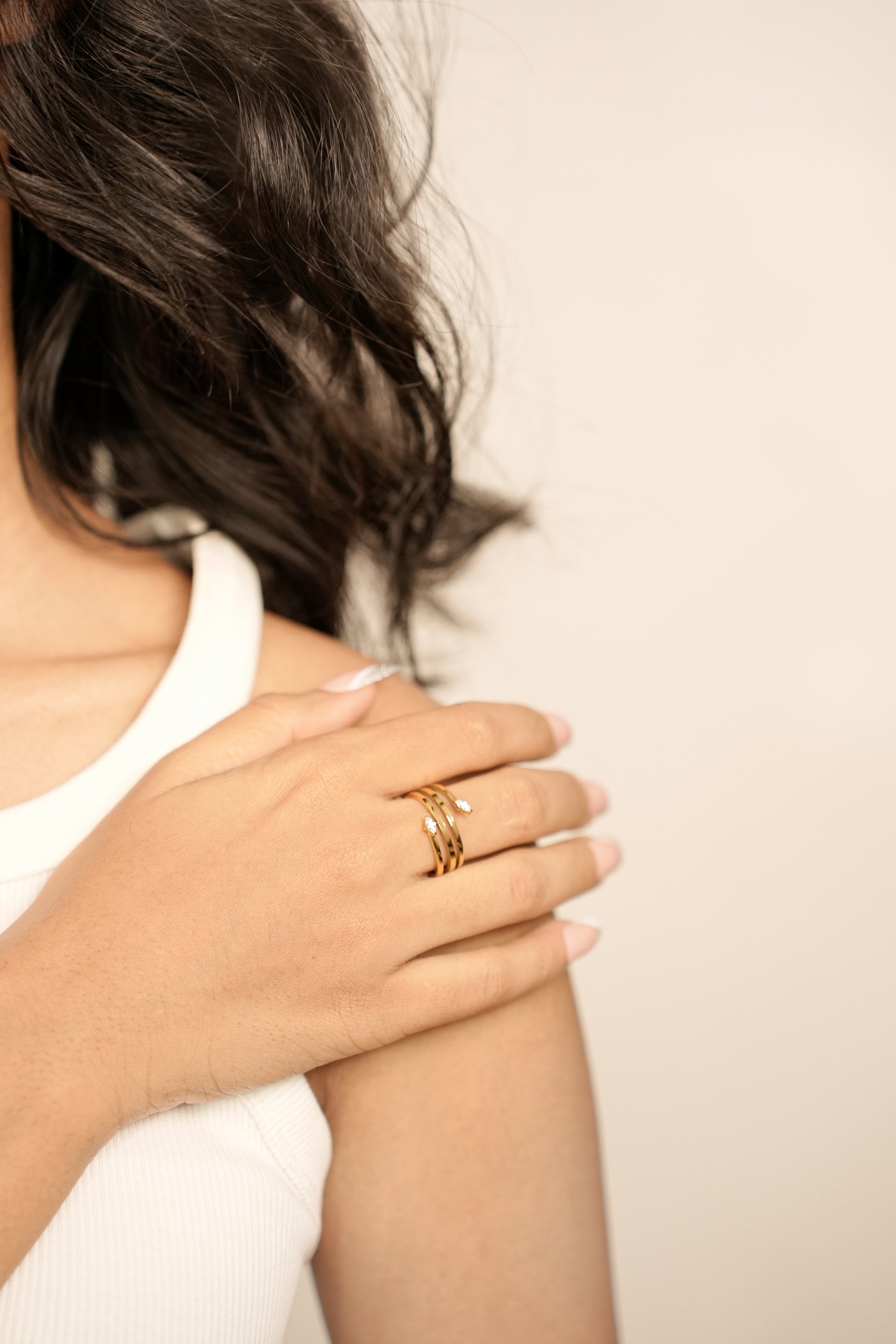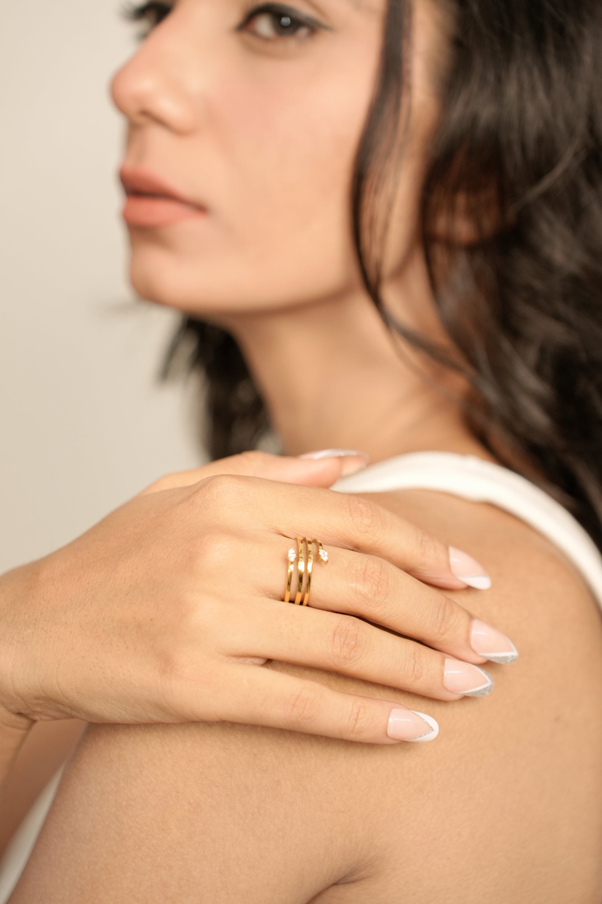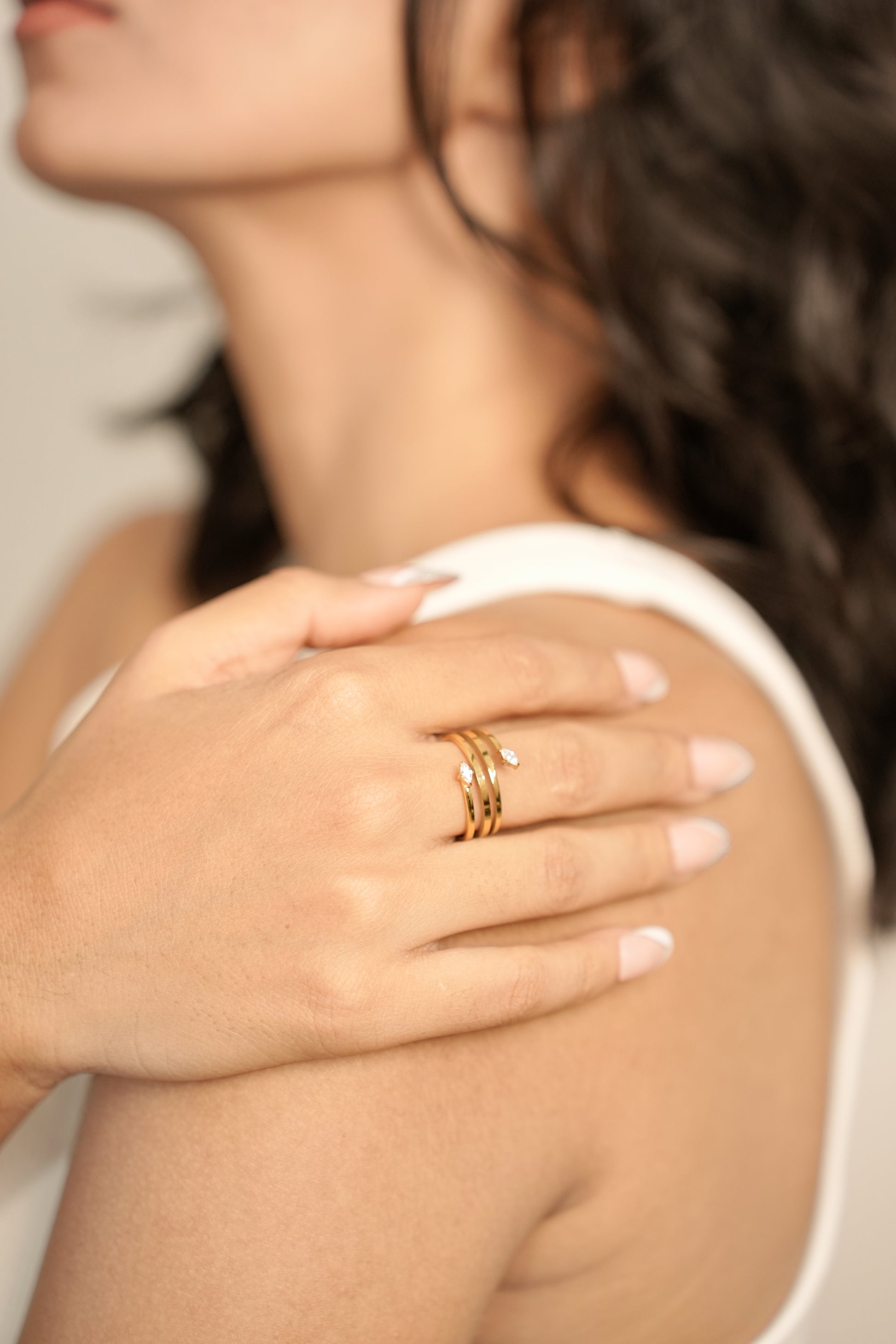 A chic triple-band ring kissed with delicate stones and wrapped in a rich 18k gold glow. Minimal, timeless, and effortlessly elegant—made to shine with you, every day.