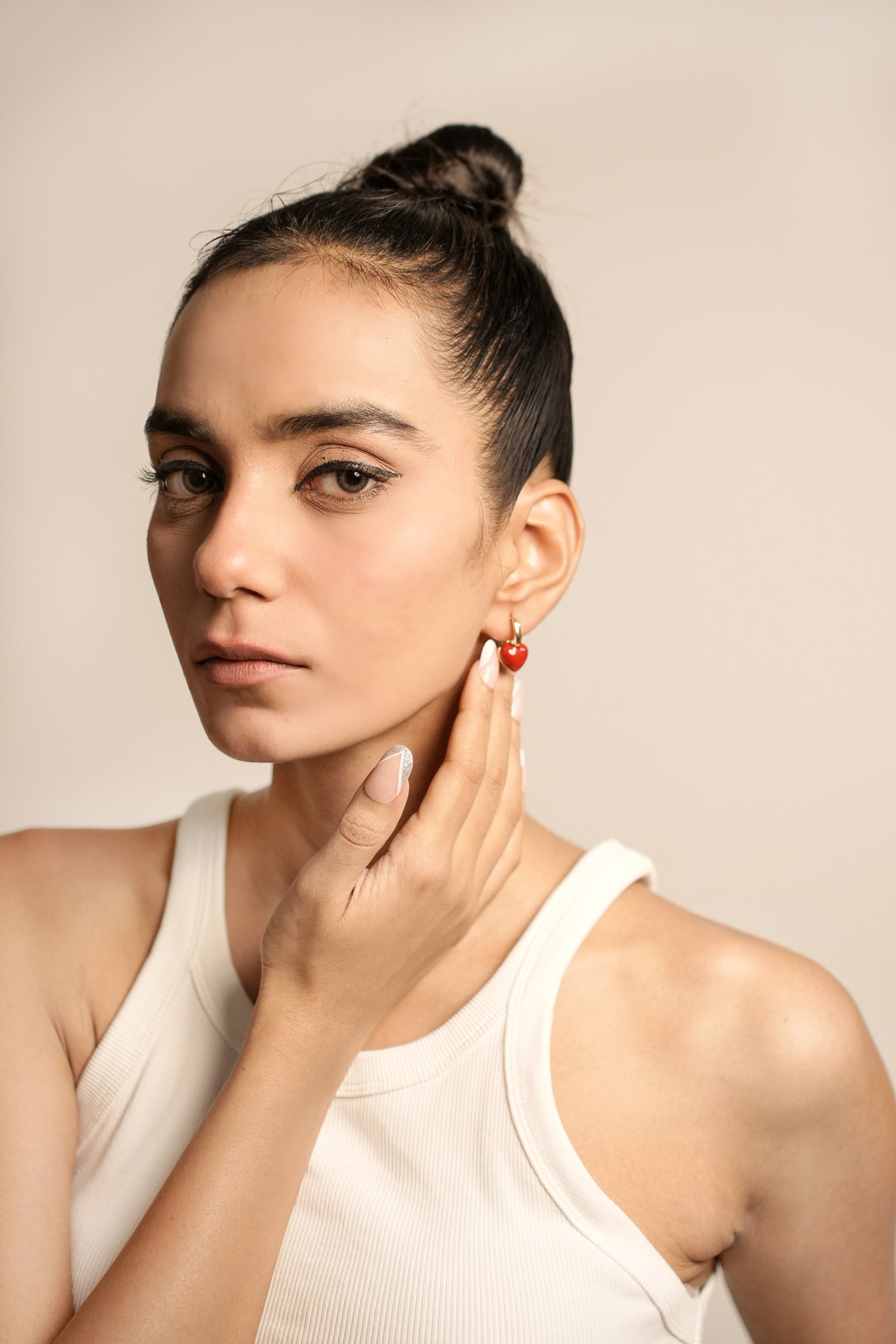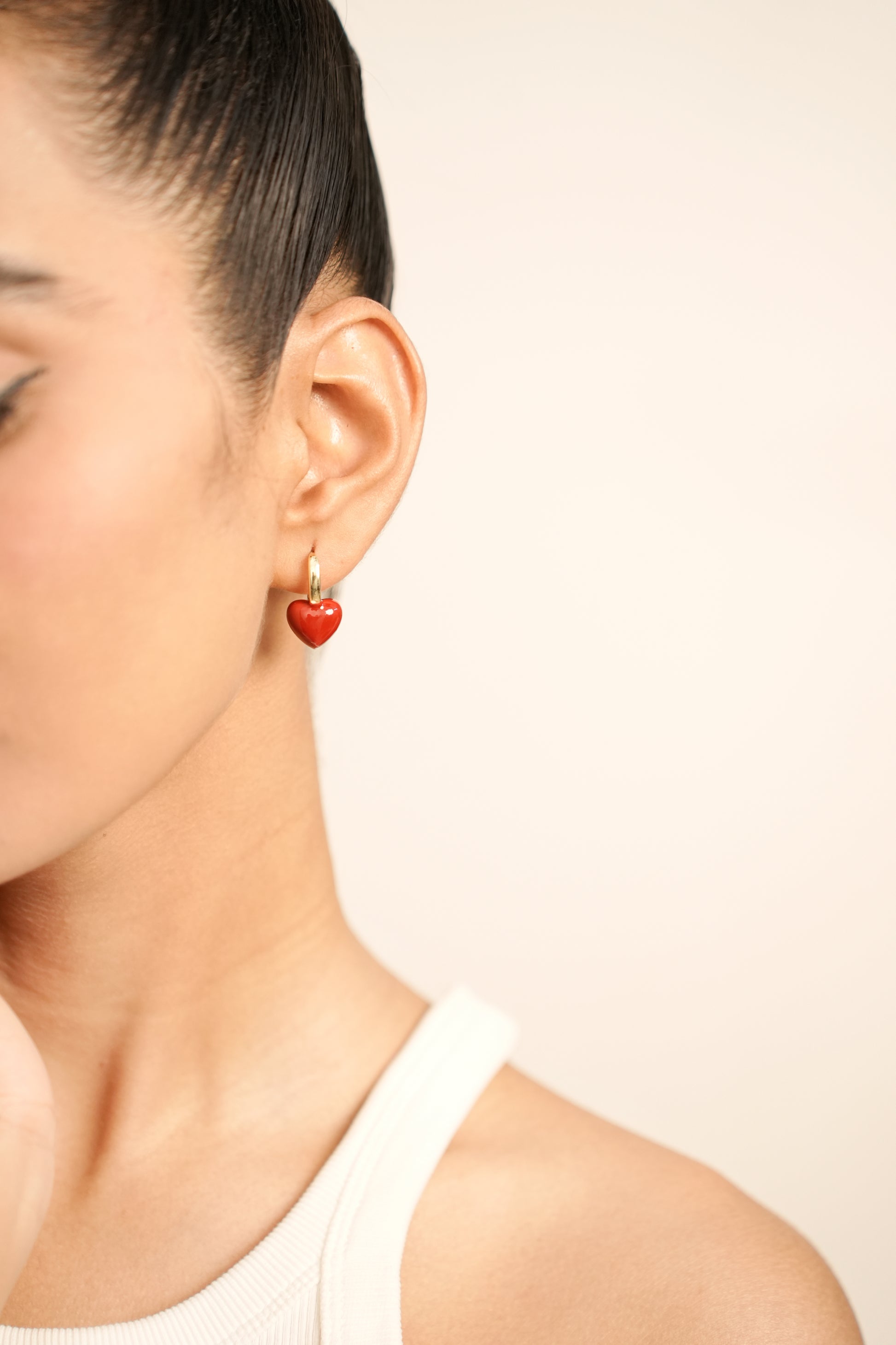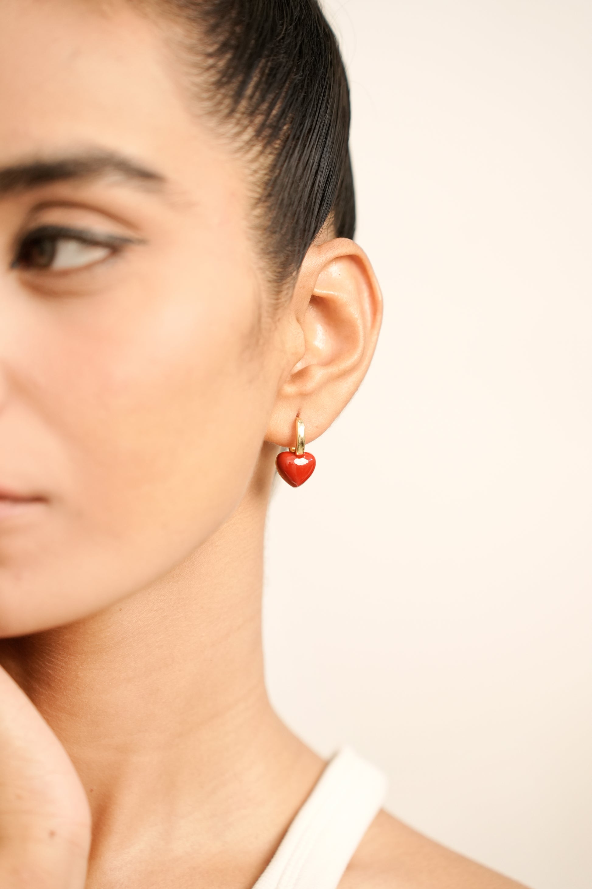 Romantic and radiant, La Pariz Amour Rouge is the perfect blend of sweetness and sophistication. Featuring glossy deep-red heart charms suspended from sleek, gold-plated huggie hoops, these earrings capture the warmth of love in a minimalist silhouette.