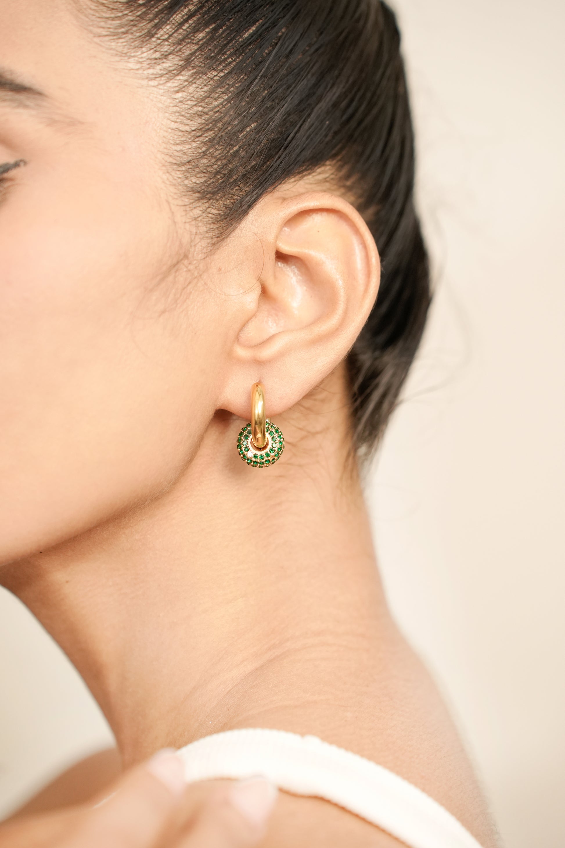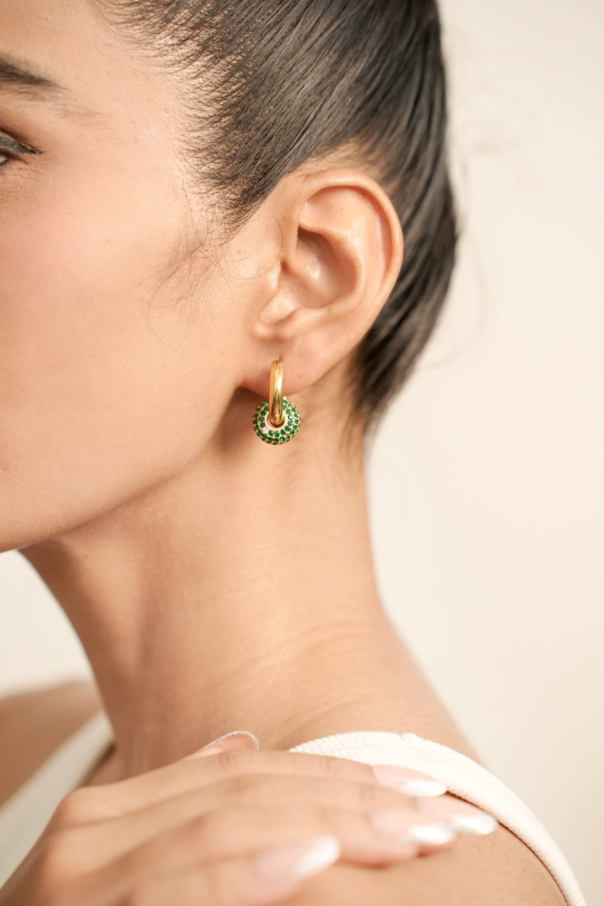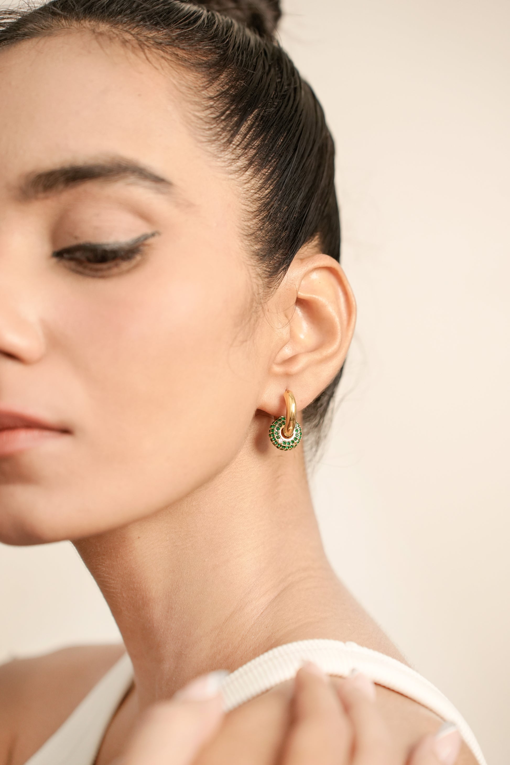 Sleek and compact, these mini gold hoops are highlighted by a curved bridge of shimmering green crystals. Their balanced mix of minimalism and sparkle makes them an effortless everyday accessory that elevates any outfit with grace.