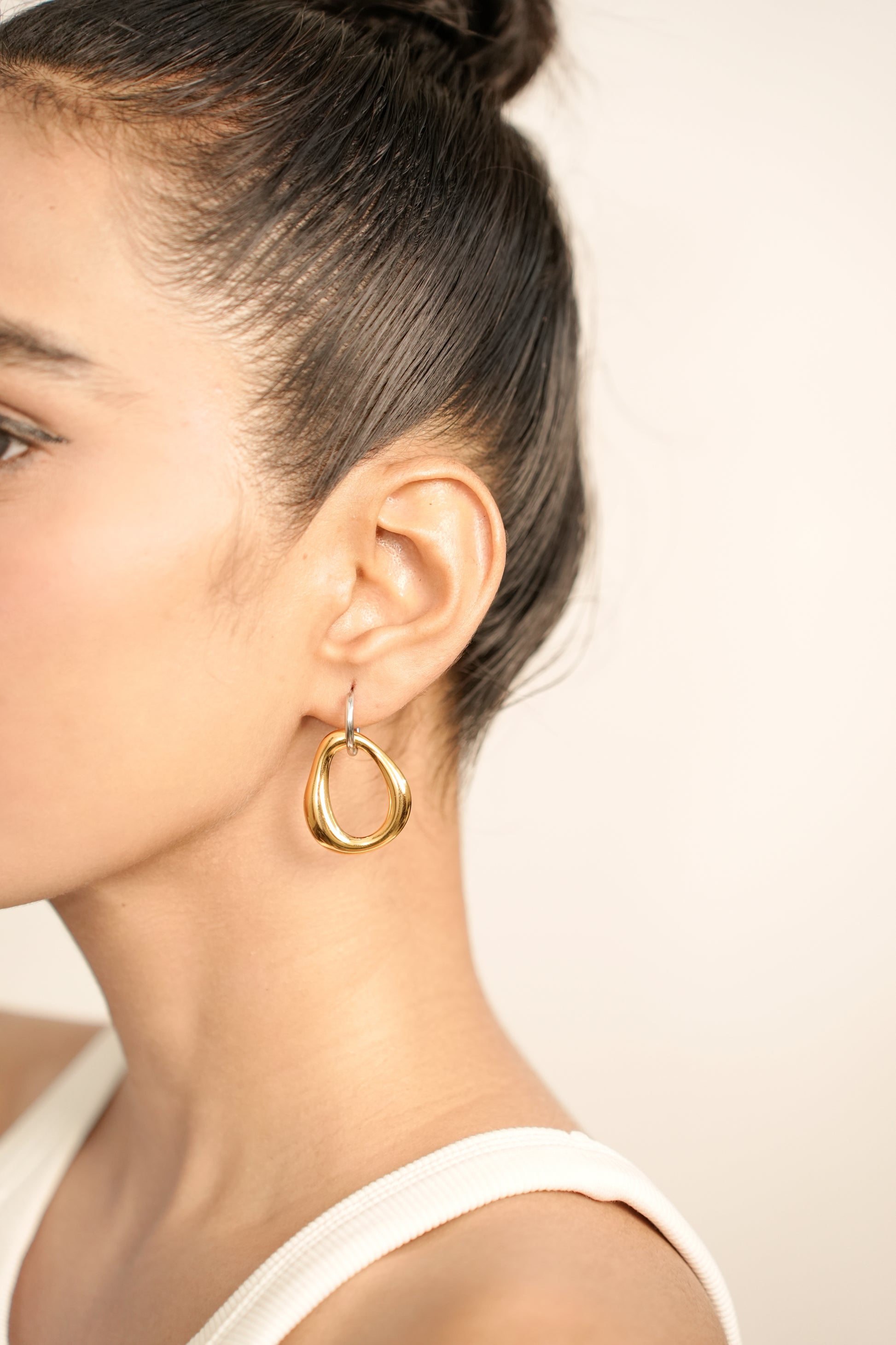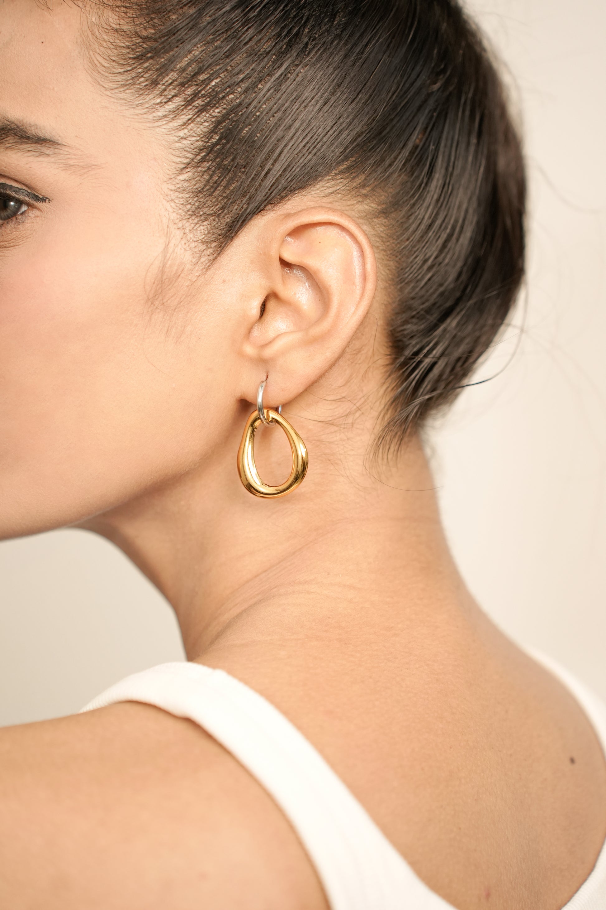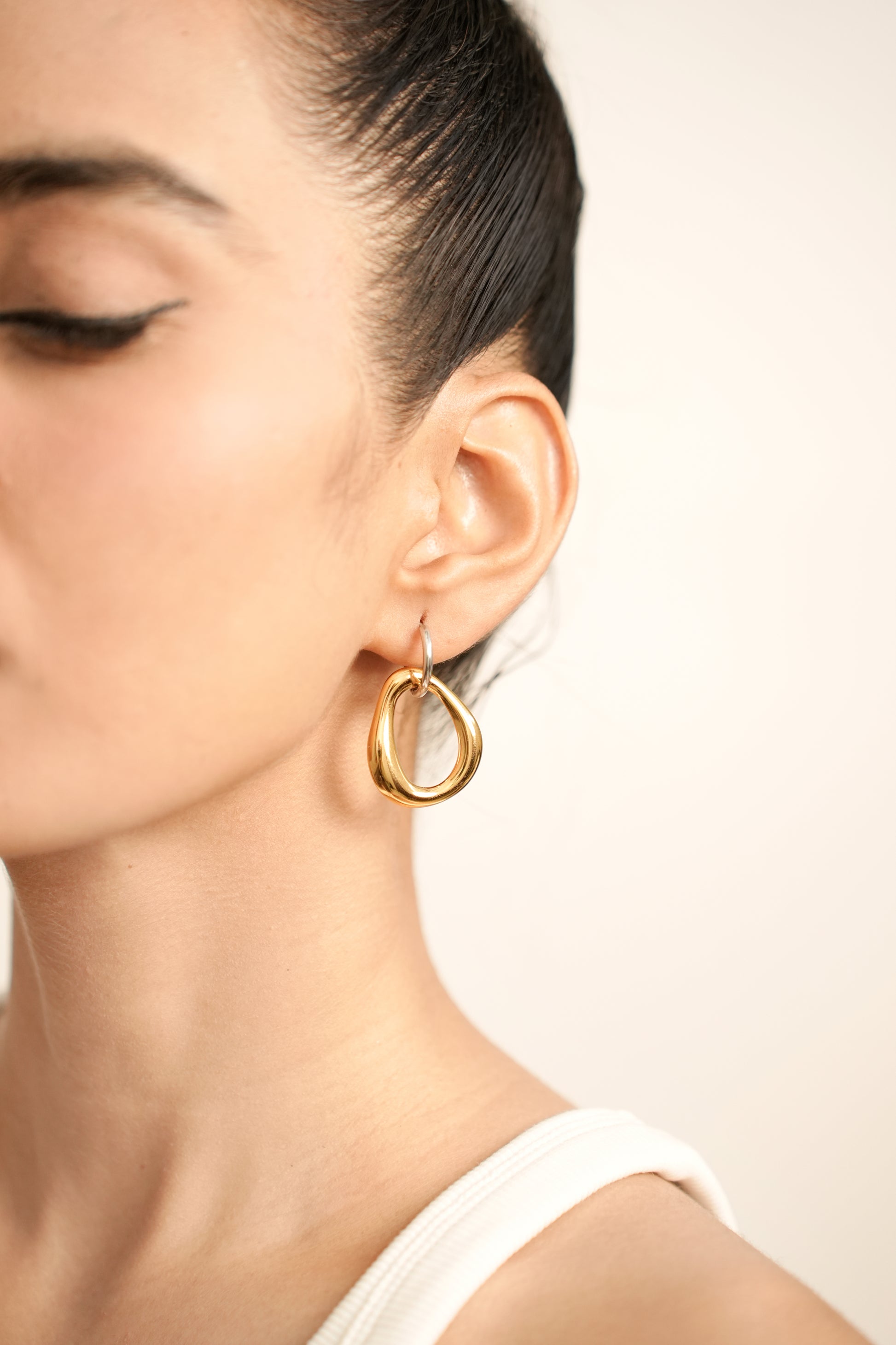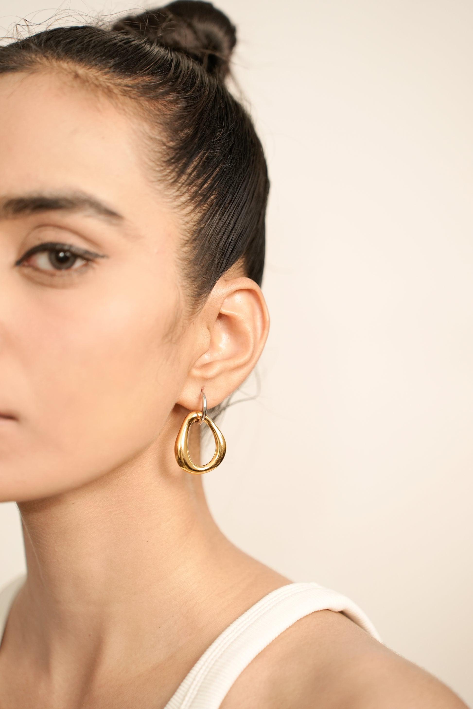 A bold interplay of silver and gold tones, these sculptural earrings feature interlocking fluid forms embodying duality and balance. Sleek, modern, and statement-making, perfect for elevating both everyday and evening looks.