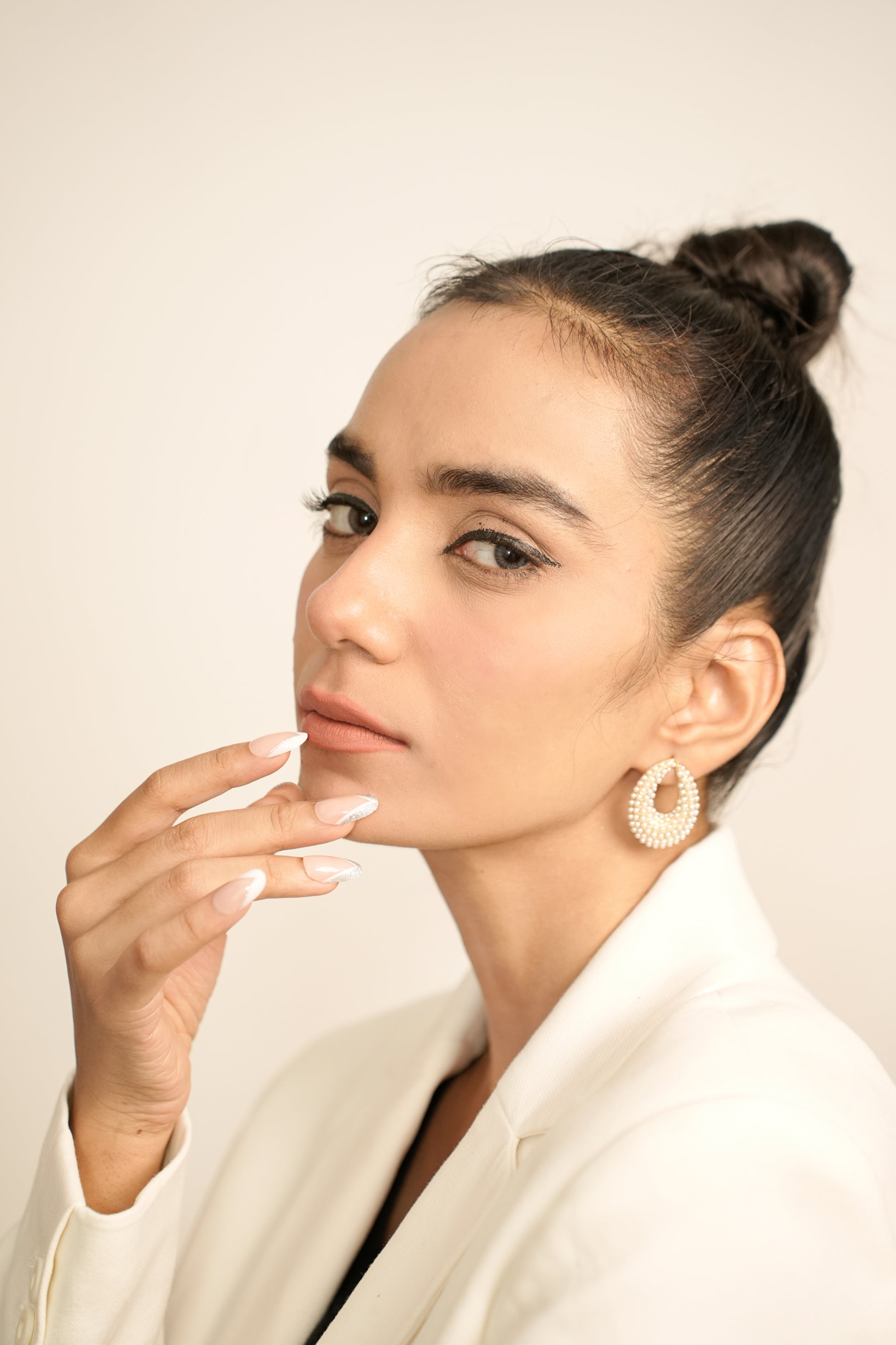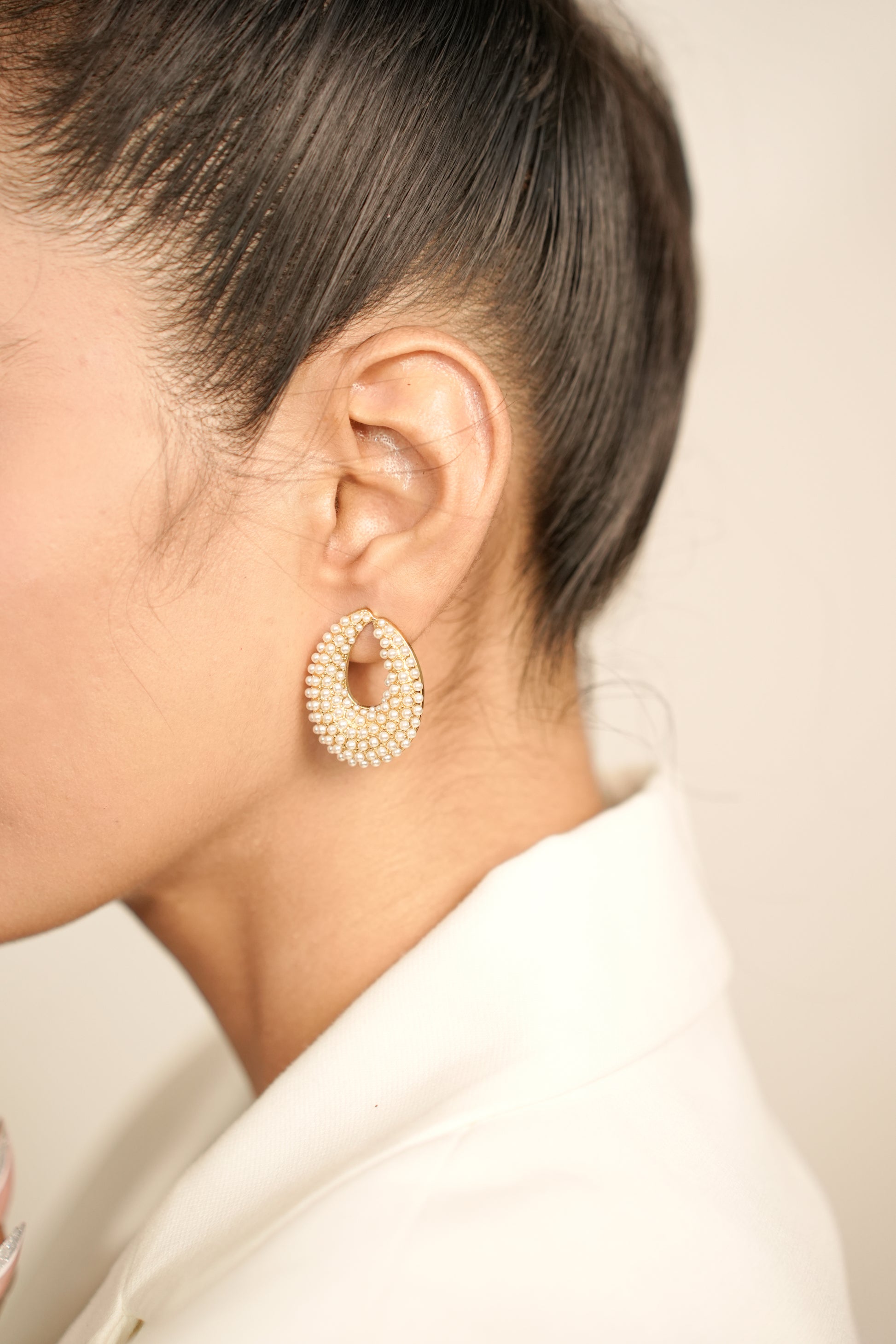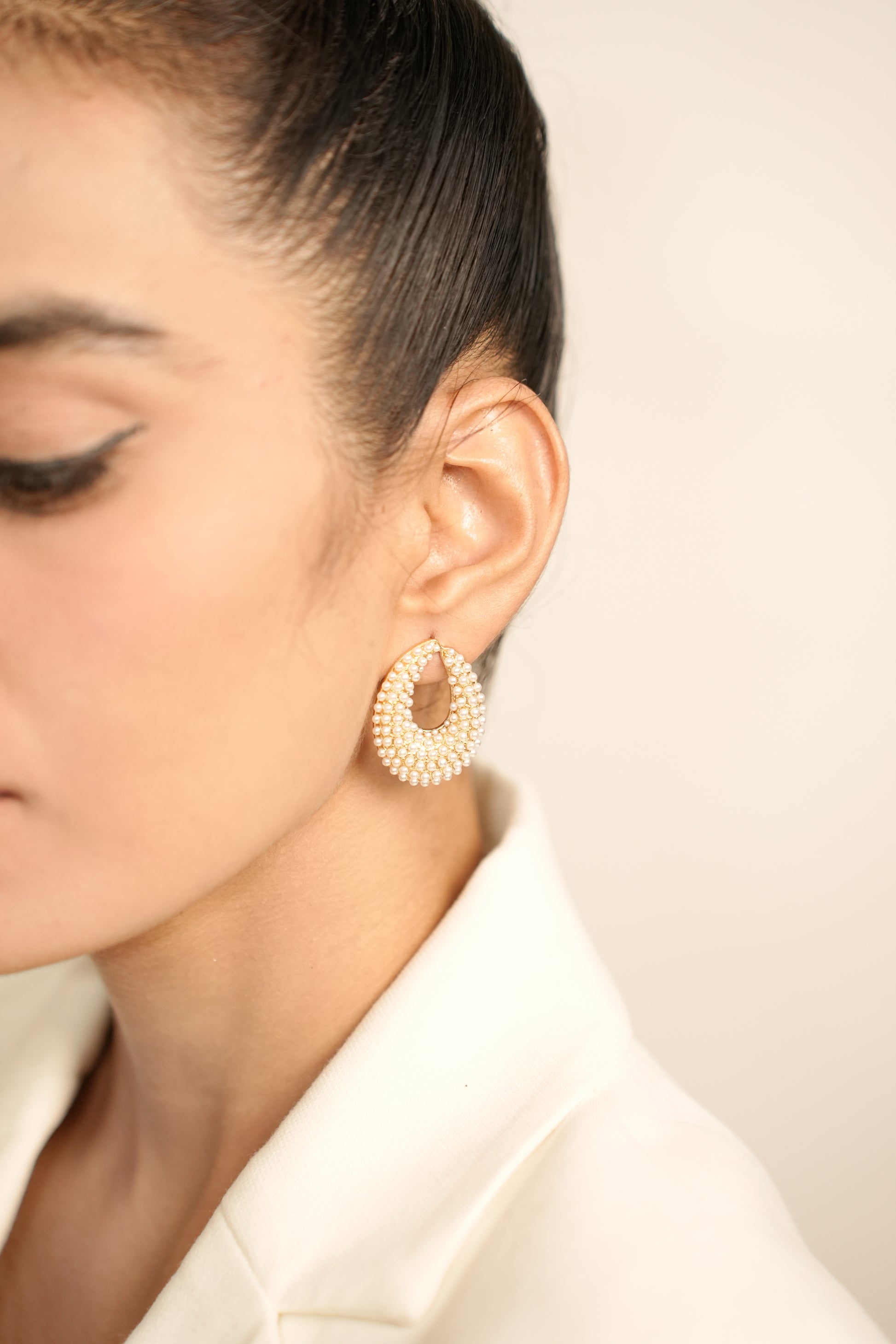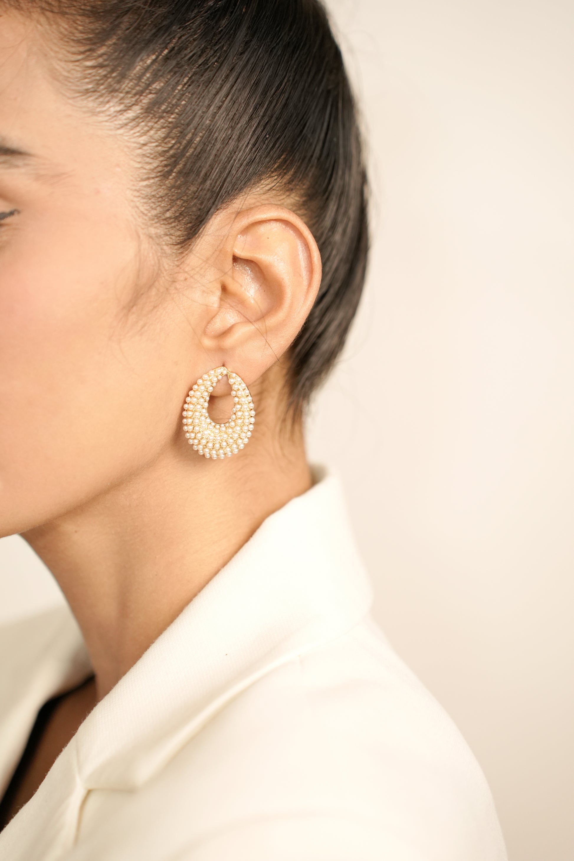 A graceful fusion of tradition and elegance, these gold-toned drop-shaped hoops are adorned with rows of delicate white pearls. The soft curve and layered design create a voluminous yet refined silhouette, making them perfect for weddings, festive occasions, or adding vintage charm to a modern ensemble. These earrings are a timeless statement of feminine allure and sophistication.