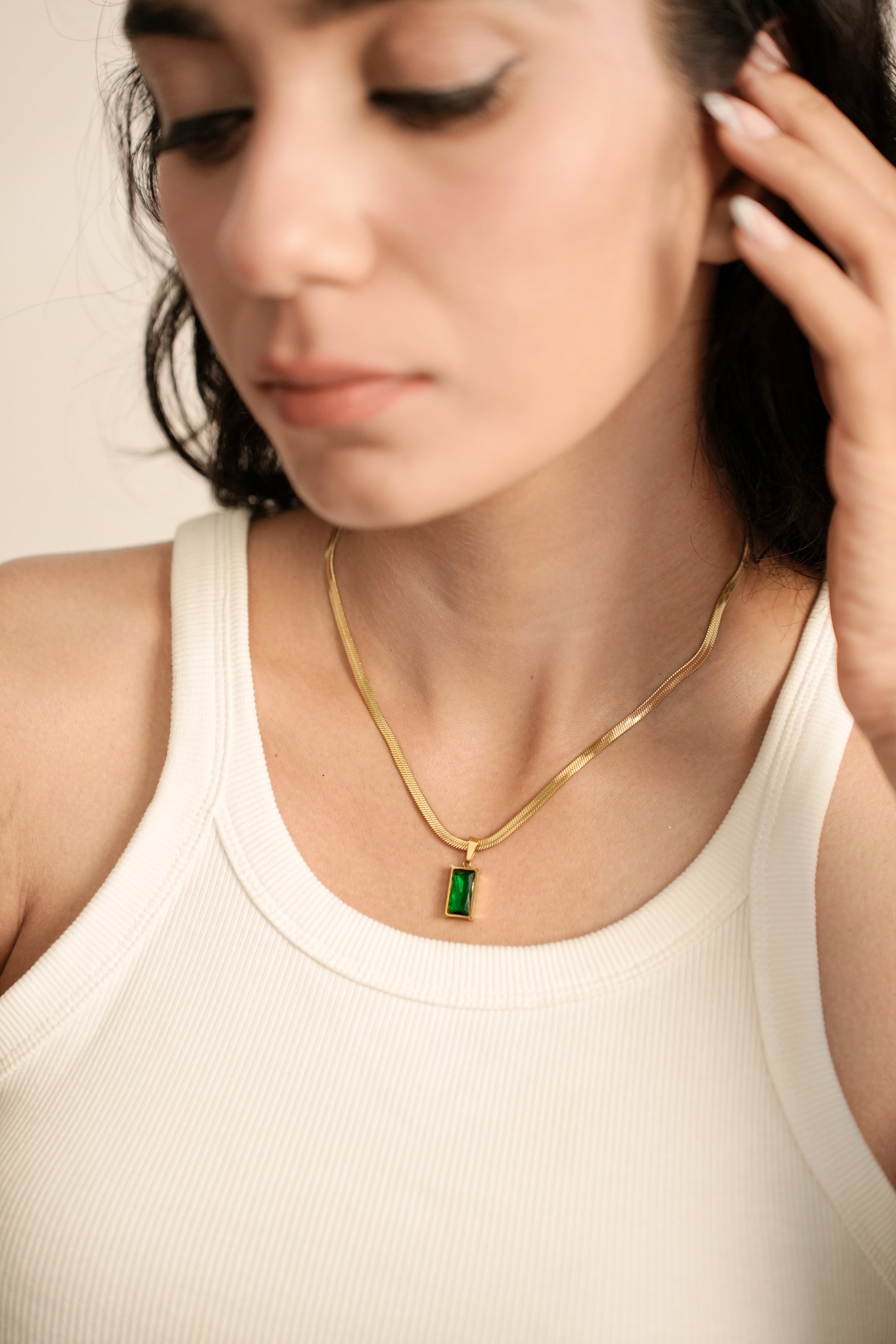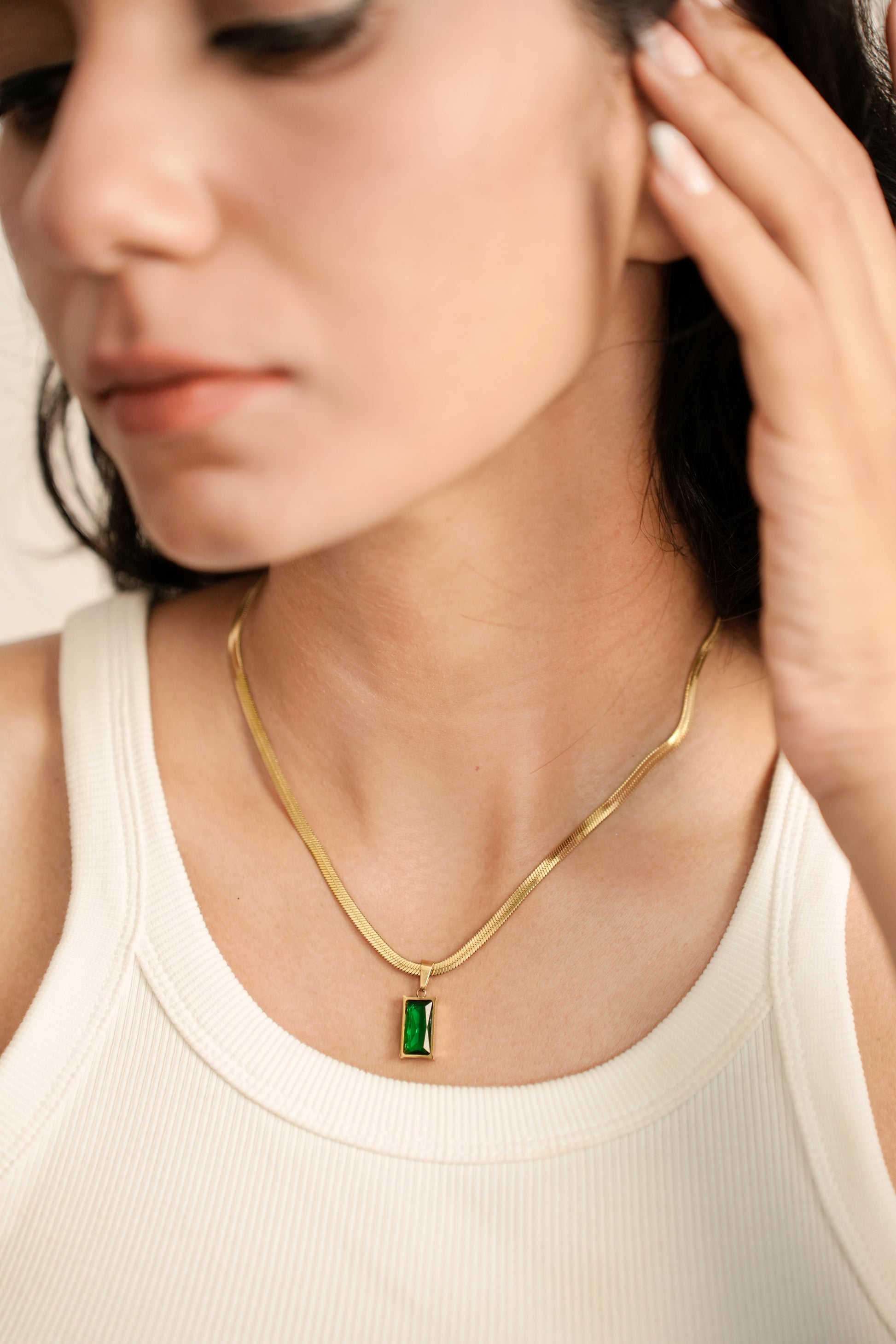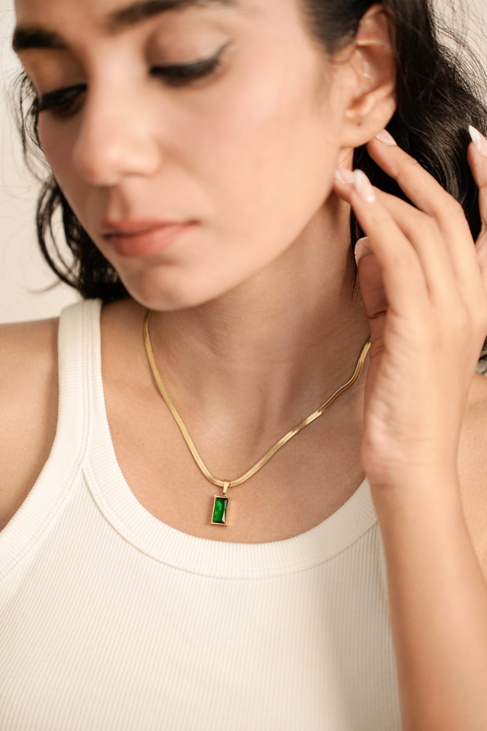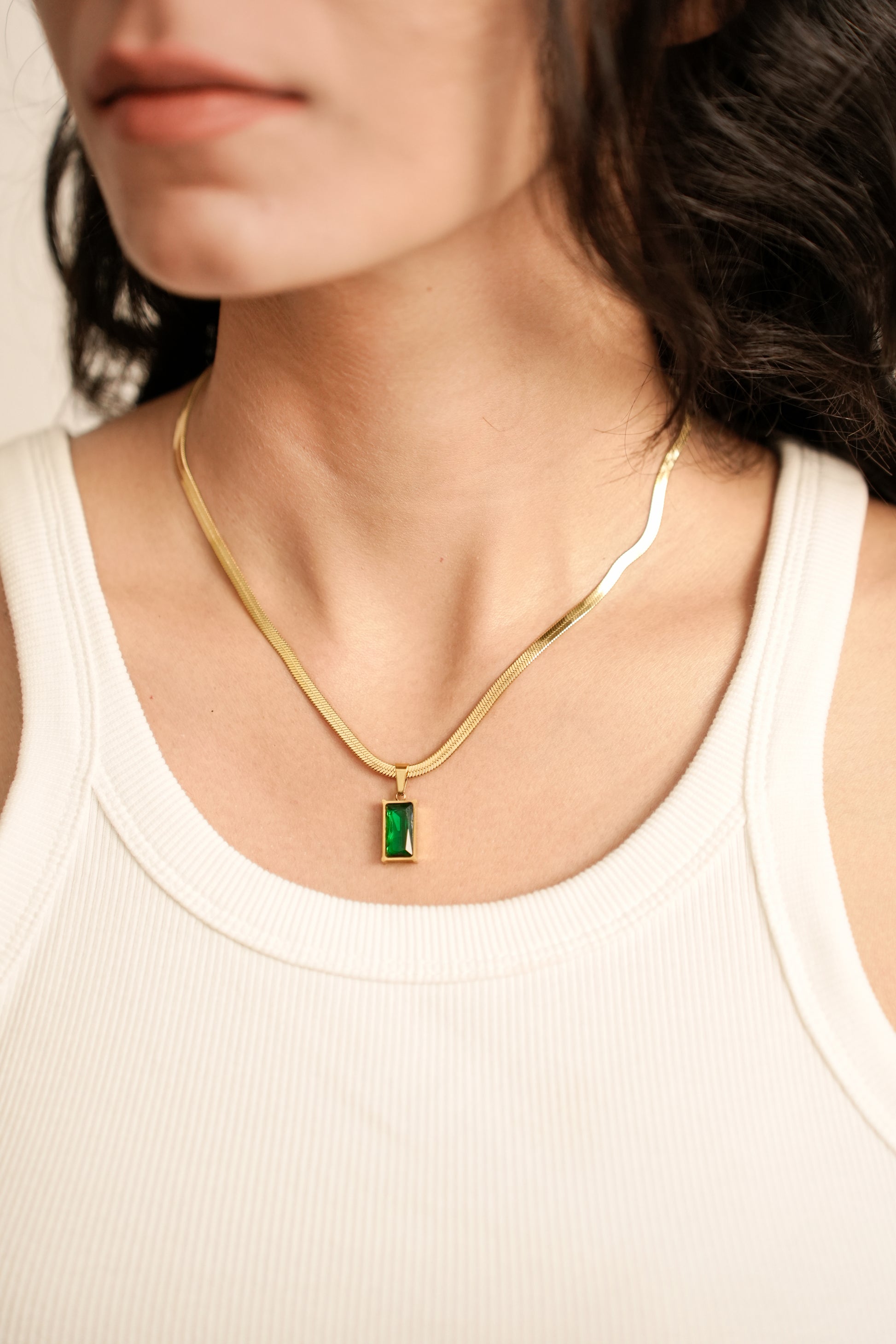 A golden embrace for a gem as vivid as a garden in spring — Vert Charmant captures the magic of green in its purest form. With its sleek gold chain and enchanting emerald stone, this necklace brings a whisper of romance and a dash of charm to every outfit.